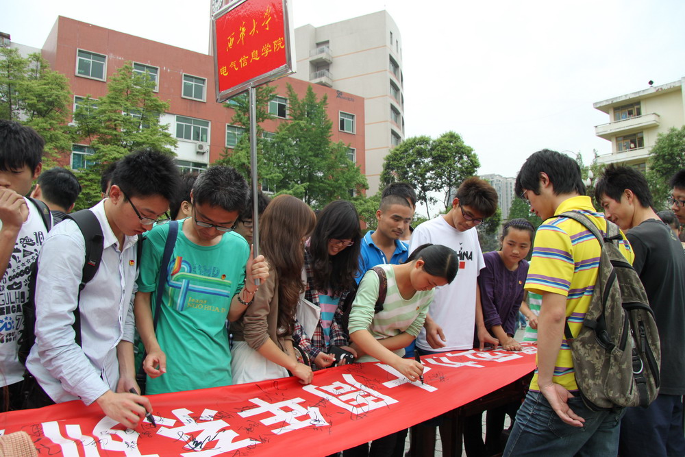 4月24日中午,全校学生干部代表和团员代表千余人,佩戴着团徽,早早来到四教明德广场集中,举行“我是团干 ,向我看齐”签名活动。各学院团委、学院学生会以及各团支部、班级,各学生组织的代表以及各学院的团员代表,纷纷在横幅上郑重签下自己的名字,承诺将在课堂和公共活动场所,佩戴团徽,亮出团干部身份,自觉接受全校青年监督,争做全校青年的表率。