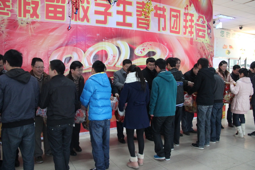 农历新年是中国人最重要的节日,而学校每年总有一部分同学不能回家过年。值此新春佳节来临之际,2012年1月20日(农历腊月二十七),学校为每一位寒假留校学生都准备了礼品、红包和团年饭,把浓浓的年味儿带到了留校同学的身边,让他们感受到了学校的关爱和温暖,在学校过上了一个热热闹闹的新年。