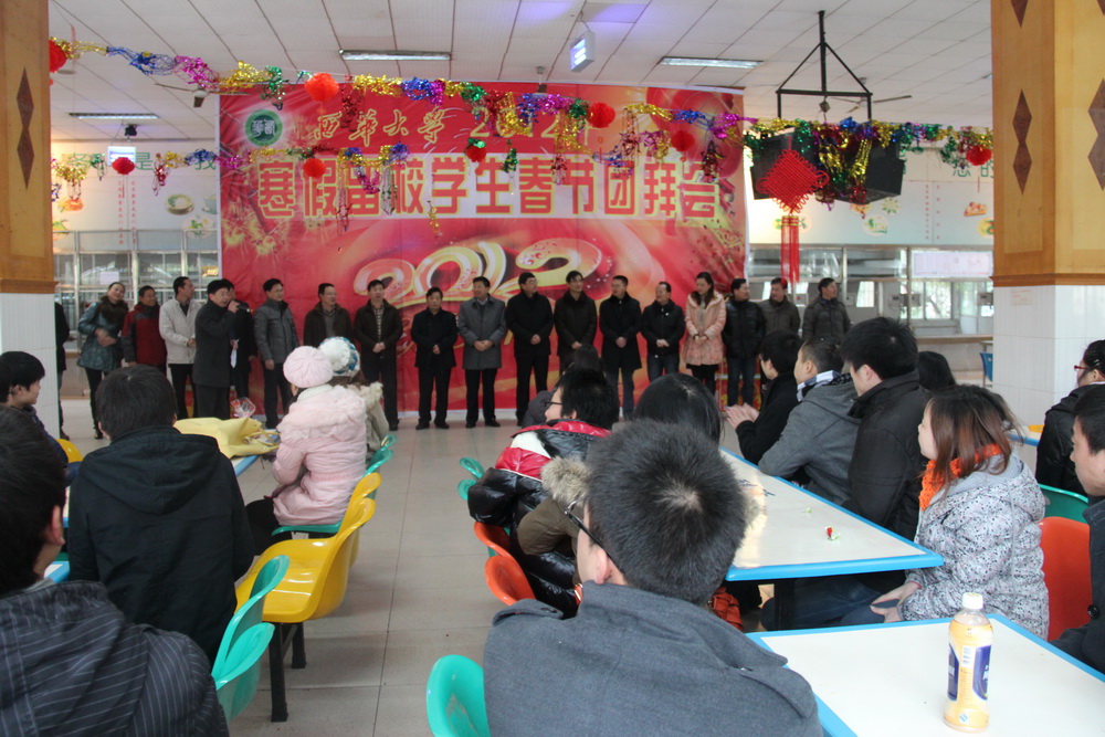 玉兔辞旧岁,金龙迎新春。上午10时,寒假留校学生春节团拜会在学生一食堂温馨祥和的气氛中拉开帷幕。校党委副书记王小林,副校长王政书,学生工作部、校长办公室、计划财务处、后勤管理处、校团委、后勤服务总公司等相关职能部门负责人以及各学院分管学生工作的书记(副书记)一同看望慰问了寒假留校学生,参加了寒假留校学生的春节团拜会。学生工作部部长徐元彬主持会议。