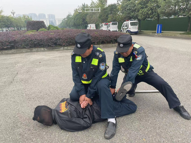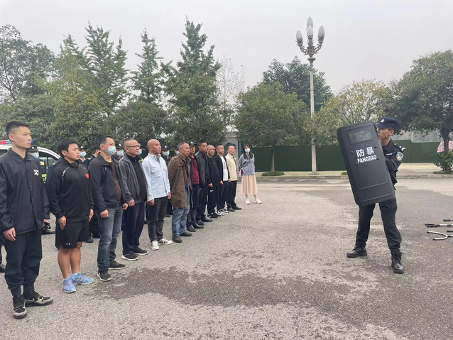 为切实保障校园平安,提高安保队伍的防范意识和应急处置技能,在遇到恶性治安突发事件时能及时果断采取措施,控制事态,维护学校的正常秩序。 10月19日上午9:30分,保卫处邀请到郫都区红光派出所副所长何鹏、特巡警大队教官兰岁平来校对我校保卫处工作人员及安保队员进行反恐防暴应急处突培训演练。