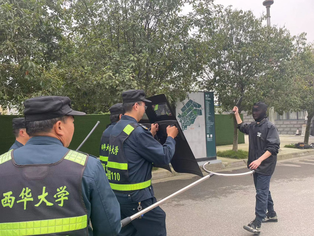 本次培训活动从涉校突发事件、安全防范常识、反恐防暴器具使用进行了讲解,邀请了国防特勤大队同学分别扮演持刀砍杀的罪犯和伤者,和安保队员重点模拟演练了 “暴力砍杀突发事件处置”科目。保卫处工作人员和安保队员熟悉并掌握防暴动作要领,切实增强了自身反恐防暴能力。