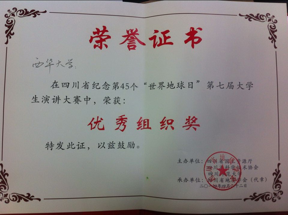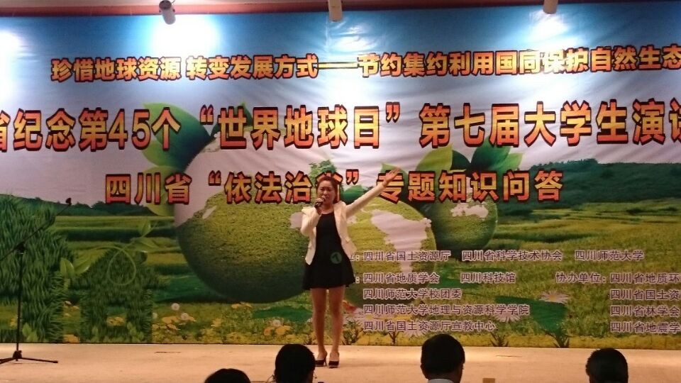4月22日,由四川省国土资源厅、四川省科学技术协会、四川师范大学联合主办的“四川省纪念第45个世界地球日”第七届大学生演讲比赛决赛在四川科技馆举行,我校人文学院黄娇同学代表学校参赛,在来自省内十余所高校中的13名选手中脱颖而出,荣获三等奖,西华大学荣获“优秀组织奖”。