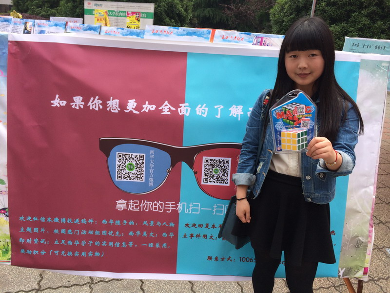 4月28日,西华大学官方微信团队在明德广场举行了第一期关注微信送奖品的活动。这是继官方微博关注转发送奖品之后,西华大学新媒体团队再一次给粉丝送福利。截止当天下午6点,有近350余名同学参与了本次活动,并且抽出了200余个奖项。 本次送出的奖品数量大,内容丰富。有生活用品台灯、风扇、精装笔记本等,也有吃货最爱铁盒曲奇、碧根果等各类零食,这也是西华大学官方微信第一次线下活动,得到了来自各学生组织和同学们的广泛关注。 西华大学官方微信是立足于师生对学校最新权威资讯的需求,通过语音、视频、图文等微信手段,介绍学校最新的新闻动态、公告通知、生活信息,也与大家分享在学习生活中的感受体会,并采取自动回复、实时回复等方式解答订阅用户的各种疑问,帮助订阅用户获得所需的生活服务、出行提示等有关信息。 我校师生可以通过关注微信公众平台来了解学校的相关信息,同时也可以参与微信公众平台不定期举行的线上、线下活动,可以获得一定的奖品。大家可以查找添加微信公众账号“西华大学”或者搜索“XiHuaUniversity”订阅,同时也可以扫描下面二维码完成订阅。