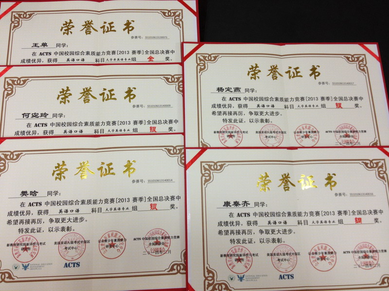 2013年(秋季)ACTS全国大学生英语素质能力竞赛四川省赛和全国赛的获奖成绩于近日揭晓。我校学子在省赛中取得专业组金奖2项,非专业组金奖4项,专业组银奖3项,非专业组银奖11项,专业组铜奖6项,非专业组铜奖14项。在全国赛中,我校学子以优异的表现展现了西华学子的风采,材料科学与工程学院2013级王单同学夺得非专业组金奖,外国语学院2012级何宓玲、2011级樊晗、杨定燕三位同学获得专业组银奖,2011级康秦齐同学获得专业组铜奖。 外国语学院连续4年承办此项比赛的四川赛区选拔赛,本次比赛,我校共有150多名英语专业和非专业同学参加,获奖同学涵盖材料、管理、人文等10个学院。为全校的英语学习爱好者搭建了一个检验英语学习水平和展现自我的平台,营造了全校英语学习的浓厚氛围。 据悉,2014年(春季) ACTS全国大学生英语素质能力竞赛四川赛区选拔赛报名工作,将于3月中旬在我校启动,外国语学院将继续承办此项赛事,希望有更多的同学在比赛中展现自己的能力和风采。 相关链接: ACTS中国校园综合素质能力竞赛大学英语口语素质能力竞赛由美国国家教育管理集团、中国人民大学国民幸福研究中心教育委员会公众青少年素质研究中心、中美素质教育科学委员会及中国就业与发展论坛组织委员会等单位联合主办。该赛事旨在促进中国大中专学生实现高质量留学、升学、就业、创业,并为之搭建与国内外高校、企业联通的留学、就业、升学、创业直通平台,着力于激发在校大学生英语口语的练习兴趣。