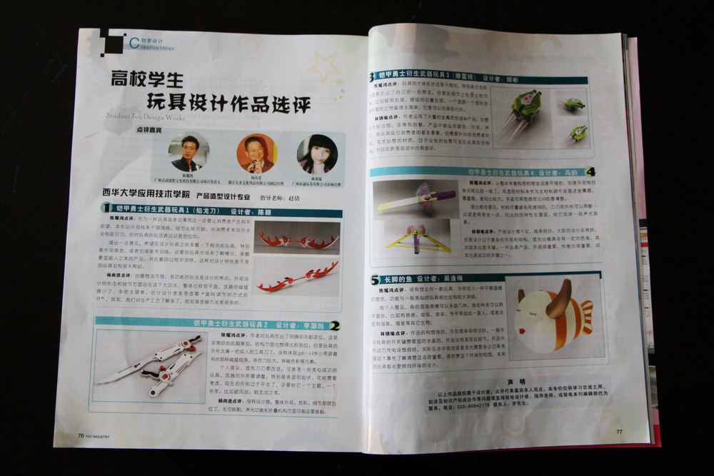 在应用技术学院赵倩老师的指导下,2010级产品造型设计(家居产品)专业的陈颖、吴逢梅、李灏剀、冯韵、邱彬等五位同学的设计作品“铠甲勇士衍生武器玩具系列”在《中外玩具制造》杂志11月期刊上发表。2010级产品造型设计家居产品设计方向是应用技术学院招收的第一届学生,学校和相关部门对该专业的建设和培养给予了大力支持和帮助,通过严格的教学管理和多个实习基地的参观学习,学生在各方面都有较大的提高。 据悉,《中外玩具制造》是目前唯一面向玩具产业双渠道(邮局和自办)发行的杂志,是国内外公开发行的玩具业主流媒体,由广东省玩具协会主办,它以大视野、多角度及时报道国内外玩具制造业动态和市场趋势,内容丰富,有国内外市场最前沿情报、产品最新潮流、行业最新动态、管理最新理念、厂商最新名录,极具指导性、前瞻性和实用性,是玩具企业生产经营的好参谋。 我校学子设计作品展示 |