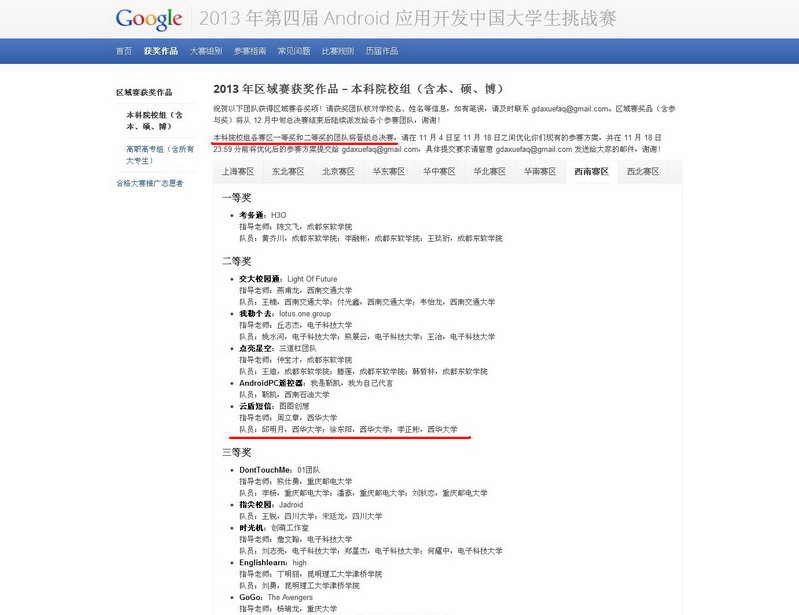 近日,Google 2013年第四届Android应用开发中国大学生挑战赛区域赛结果揭晓。由我校数学与计算机学院软件工程专业2010级学生邱明月、徐东阳、李正彬组成的参赛队伍喜获西南赛区二等奖。