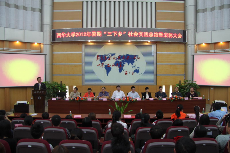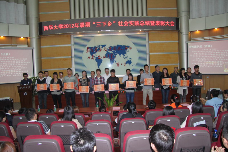 9月28日,2012年暑期“三下乡”社会实践总结暨表彰大会在四教报告厅隆重举行。校党委副书记王小林,党委办公室、党委组织部、党委宣传部、学生工作部、保卫处、校团委、教务处、研究生部等部门负责人出席了大会。各学院团委书记、主要学生干部、各暑期“三下乡”社会实践服务队代表、全校志愿者代表等400人参加了大会。 校团委书记蒋志勇对2012年暑期“三下乡”社会实践的基本情况作了介绍。今年我校的暑期“三下乡”社会实践活动从6月初启动,全校共集中组建团队100余支,参与集中实践的学生达1500余名,服务的地点涵盖彭州、郫县、南充、西昌、贵州等地。各团队都开展了为期一周至一个月的社会实践和志愿服务活动,服务内容涵盖城乡环境综合治理、扶贫济困、新农村建设、关爱留守儿童、国土资源保护、卫生宣传、义务支教等。据统计共举办各种暑期兴趣培训班100余个,覆盖中小学生2000余名,新建社会实践(实习)基地5个,发放防灾减灾、卫生、环保、普法等宣传资料7万余份,收集并捐赠书包、文具、书籍、体育用品等价值达3万余元,实践形成调研报告40余篇,心得体会360余篇,收到新闻稿件200余篇,活动图片1000余张。外国语学院团委书记曾真和社会实践先进个人王扬丹同学分别代表受到表彰的集体和个人发言。