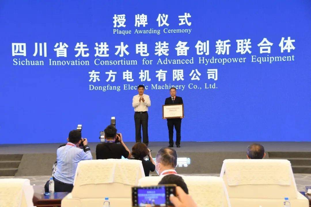 8月27日,2022世界清洁能源装备大会在德阳开幕。在大会产业投资推介和政策报告会上,四川省副省长罗强为东方电气集团东方电机有限公司牵头、西华大学等共同组建的四川省先进水电装备创新联合体授牌,东方电气集团东方电机有限公司党委书记、董事长王军代表创新联合体接牌。