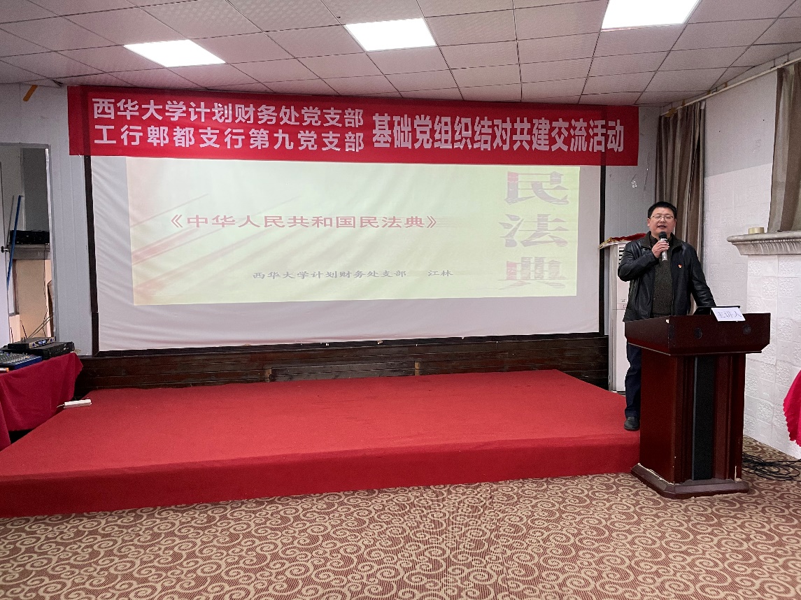 11月28日下午,西华大学计划财务处与中国工商银行郫都支行第九支部举行基层党组织“结对共建”深入交流活动。会上,计划财务处处长、党支部书记江林为全体人员作《中华人民共和国民法典》专题党课。中国工商银行郫都支行行长罗晓东向与会人员传达了中共十九届五中全会会议精神。