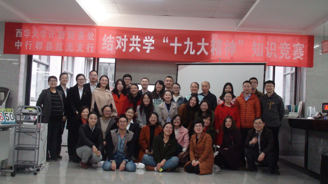 为了学习贯彻党的十九大精神,按照《中共西华大学委员会关于学习宣传贯彻党的十九大精神的通知》以及中国银行郫县支行党总支的要求,西华大学计划财务处支部和中国银行郫县西华大学支行创新学习方式,组织了主题为结对共学“十九大精神”的知识竞赛,以期将大家学习十九大精神的激情进一步推向高潮。