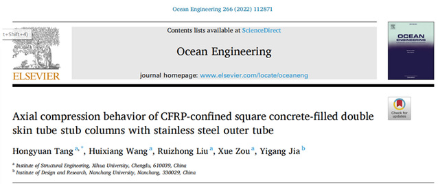 近日,我校建筑与土木工程学院唐红元教授在国际土木工程学科TOP期刊Ocean Engineering(IF=4.3723)发表题为“Axial compression behavior of CFRP-confined square concrete-filled double skin tube stub columns with stainless steel outer tube”的最新研究成果。