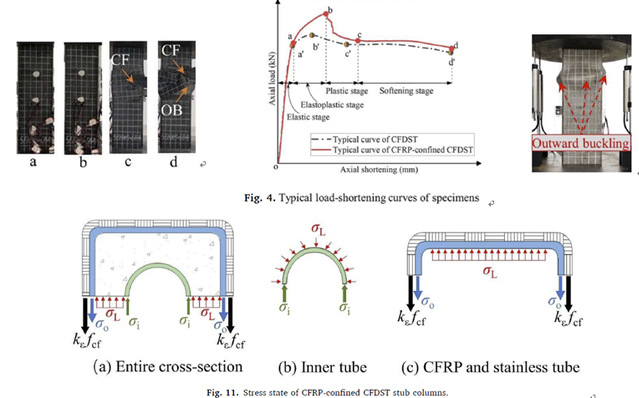 外包不锈钢管的方中空夹层钢管混凝土短柱(CFDST)是一种新型复合柱,具有优异的耐腐蚀性能,在海洋工程中具有广泛的应用潜力。CFRP约束CFDST复合柱是通过在不锈钢外管表面缠绕碳纤维增强聚合物(CFRP)材料,可以进一步增强外不锈钢管在海洋高氯离子环境下的抗腐蚀性问题,同时,也可以用于对CFDST复合柱承载力提升和加固。