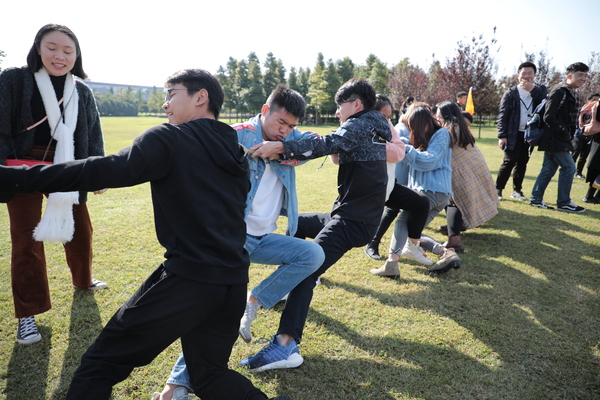 在热身活动结束后,正式进行第一项活动拔河比赛,各队通过抽签方式确认双方队伍,比赛开始前,各队成员积极地商讨对策,各队队长也娴熟的“排兵布阵”。在拔河比赛中,各小组成员都使出浑身解数,拼尽全力来参与这项活动。