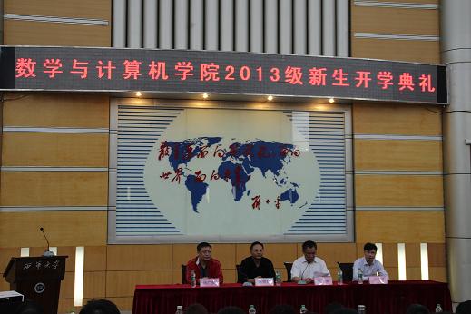 近日,数学与计算机学院2013级新生开学典礼在四教报告厅举行。学院党委书记张岩,院长何明星,院党委副书记、副院长毕达平,副院长陈广贵,各系主任及副系主任、学院党政办、教学办、学工办、院团委等相关老师以及全体新生辅导员,全体2013级483名本科生参加了开学典礼。开学典礼由张岩主持。