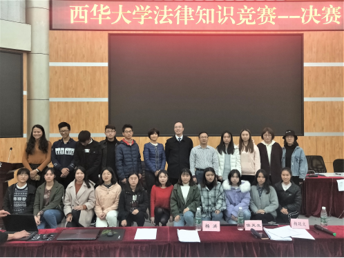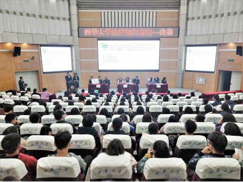 为了响应我国建设社会主义法治中国的号召,营造良好的校园法治文化氛围,提高大学生的法治观念和法律素养,由校团委主办,知识产权学院、法学院团委承办的2018年西华大学法律知识竞赛于11月11日晚七点在四教报告厅成功举行。出席本次竞赛的嘉宾有学院学工办主任张文静、团委书记杨洪及2018级辅导员刘颖,主持人为雷旺、侯皓雯。