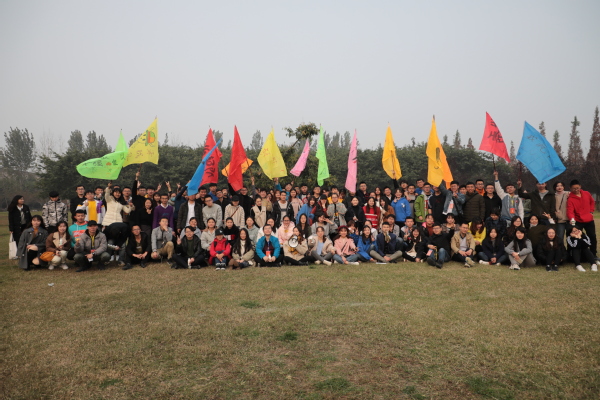 活动开始,各成员分组完成后,各组讨论选出队长、确认队名、设计队旗并用水彩笔画出属于各自队伍的图案。在队旗设计完成后,各队进行自我介绍,熟悉本队成员。接着各对分别进行队旗展示。随后进行第一项活动五毛一块,即男生代表一块,女生代表五毛,每组出两个代表,裁判说多少大家就迅速抱团,未组合成功的则淘汰。裁判才将数字说出口,场上的人就灵活地开启了组队模式,稍微慢一点的则遗憾出局,未上场的同学看得也是不亦乐乎。第二项活动是三人两足,即每组内分三小队:三人、两人、两人各位一队绑腿,在一定距离内进行接力,用时最少组获胜。正式开始前每小队都尝试了一下,许多小队都出现了磕磕绊绊、甚至跌倒的情况。不过,在稍加练习后,大家都适应了彼此的频率,以至于正式比赛时,有的小队甚至都能跑起来。很好的完成了比赛。