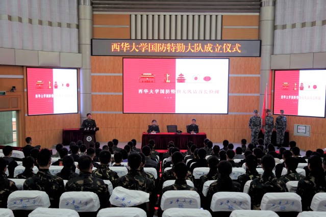 在全体队员齐唱《中国人民解放军军歌》后,西华大学学生国防特勤大队正式成立。