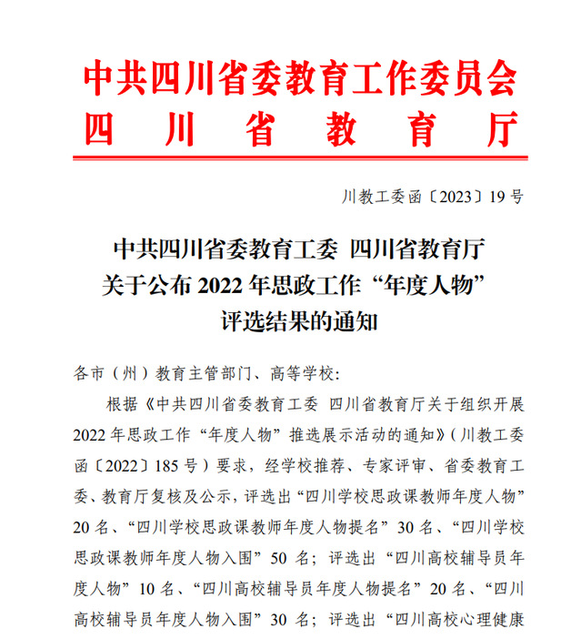 近日,由中共四川省委教育工委、四川省教育厅组织开展的“2022年思政工作年度人物”评选活动结果公布,我校马克思主义学院党委书记万远英教授荣获“四川学校思政课教师年度人物”,全省高校仅10名,马克思主义学院副教授刘英荣获“四川学校思政课教师年度人物入围”,全省仅50名;能源与动力工程学院辅导员张蓝月入选“四川高校辅导员年度人物”,全省高校仅10名;心理健康教育中心副教授魏赓入选“四川高校心理健康教育年度人物提名”,全省高校仅10名。