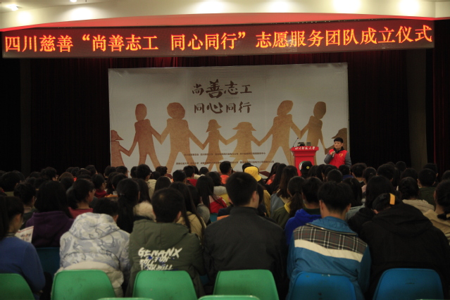 四川省慈善总会唐鹏先生对“什么是志工”的专业化志愿服务理念进行宣讲,他向同学们传递了在从事志愿服务活动时要秉承以“友爱、互助、 奉献、 进步”为中心的服务宗旨,在帮助他人的过程中得到自我的提升。除此之外,他还对2018年的志愿服务工作作了详尽的总结,同时对2019年的志愿服务活动提出了要求和期望。最后,唐鹏先生带领全体受助学生进行了四川慈善“尚善志工 同心同行”志愿服务团队成立暨志愿服务宣誓仪式。