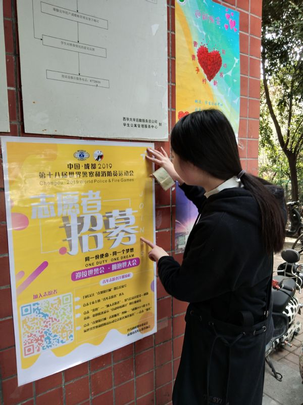 启动仪式结束后,校志愿者服务总队通过在学校内张贴或摆放宣传海报、横幅、展架的方式向西华师生推广世警会活动,扩大影响力,营造良好的志愿服务氛围。