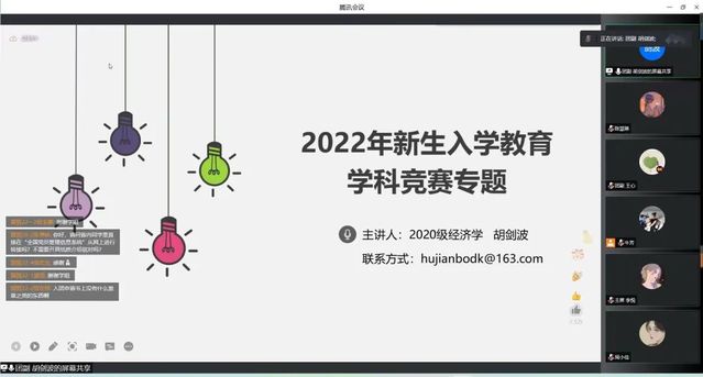 随后,2020级经济学胡剑波就新生入学教育学科竞赛专题从认识学科赛事、应对学科竞赛、做好学科竞赛和常见问题答疑四个板块进行交流与分享。其中,他强调新生们要重点关注并积极参加全国普通高校学科竞赛排行的赛事以及在教育厅文件、政策要求下的以各省教厅直属高校举办的全省范围内的大学生学科专业竞赛,并列举出推荐的竞赛目录。最后,此次活动在答疑中圆满结束。