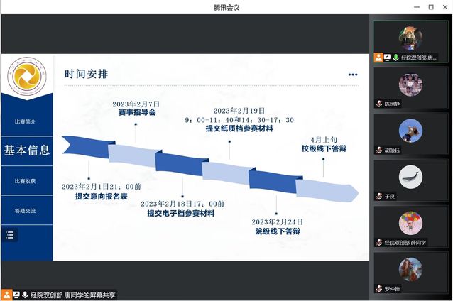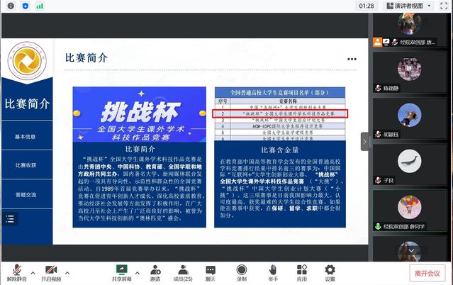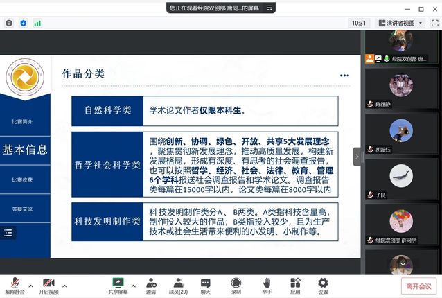 1月15日下午,第十八届“挑战杯”全国大学生课外学术科技作品竞赛经济学院选拔赛赛事宣讲会以云会议形式在线上顺利召开。本次会议由经济学院创新创业俱乐部干事薛琳主持,经济学院创新创业俱乐部部长唐诗琴主讲,25人参与了这次会议。