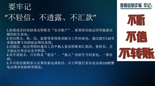 他指出,要做到“不轻信、不透露、不汇款”。一是拒接或及时挂掉谈及转账至“安全账户”、索要短信验证码等敏感话题的陌生来电;二是对自称公、检、法、监察等系统要求配合工作的来电,通过拨打110寻求属地警方协助验证情况真伪;三是对微信、短信等即时通讯工具中熟人要求转账和汇款的,要核实、交叉验证后再决定是否转款;四是对不说姓名、只自称是“朋友”“熟人”的陌生号码来电,一律挂掉;五是不可轻信报称家人出事的来电或短信,可立即拨打亲友电话或110报警电话请求协助核实情况;六是不扫描来路不明、用途不清的二维码,不点击各类手机短信和彩信、互联网发来的可疑链接,防止所用设备中木马病毒;七是不轻信淘宝“刷单”、兼职提成、不用学习直接拿学历学位、代办高额信用卡等广告,记住“天上不会掉馅儿饼”的真理;八是对于各类网络红包,不要轻易点击,严防犯罪分子利用红包形象挂用木马程序盗取财物;九是对微信联系人头像、昵称进行审慎甄别,严防高仿虚假身份诈骗;十是对非正规金融机构以集资、预付款、购买理财产品等名义吸收公众存款的广告坚决说不,严防上当受骗;十一是洁身自好,远离赌博、色情、非法物品交易等网站,防止遭受木马病毒攻击,造成财物损失。
