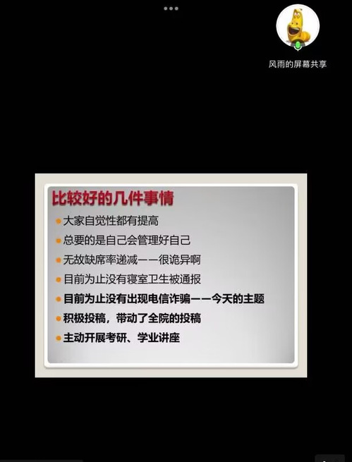 首先,易老师就专业前期学习情况进行了点评:全专业同学无故缺勤率下降,寝室卫生保持良好,自我管理意识增强等。他强调同学们要不断提高学习能力,共同营造良好的成长氛围,并希望全体同学遵守请假制度,树立学生纪律意识。