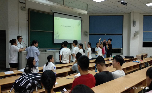 随后进行的是知识竞答活动,题目来自“学习强国”APP和网上查询相关知识。比赛分组进行抢答,每四到五人组成一个小组,共有5组进行参赛。比赛时,两队互相进行PK,每位同学在答题时都认真思考,甚至出现了同时举手抢答的情况,各小组不甘示弱,分秒必争。经过激烈的决逐,有两队获得了此次知识竞答的胜利。