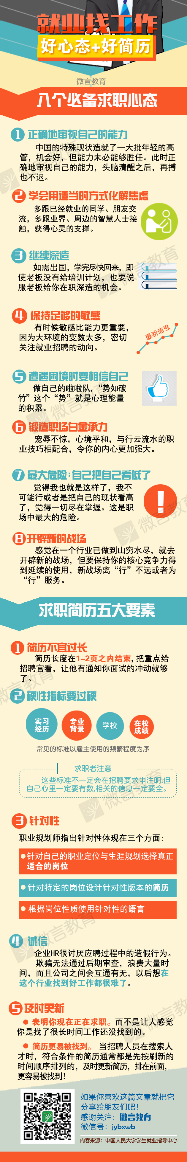 对即将毕业的“童鞋”来说,找工作一定会面临很多压力,但千万不要让自己在”焦虑”状态下沉浸很久,因为焦虑会消耗你的能力。相信坚持走下去的过程中会有答案。下面一图教大家八个必备求职心态外加求职简历必备五大要素,希望可以帮大家在求职路上走得更自信、更轻松。