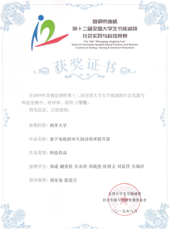 本届大赛自启动以来,吸引了包括清华大学、上海交通大学、浙江大学、西安交通大学、重庆大学等393所高校报名,共计4102件有效作品成功申报,参与高校数和作品申报数量均创历史新高。由能源与动力工程学院胡安奎、张蓝月老师指导,2017级水利水电工程专业郑成、谢美铃、吴承洪、邓晓慧,2018级能源与动力工程专业侯智文、刘显萍,2018级水利水电工程专业吴瑞洋设计的项目“基于电轨的再生制动效率提升器”获全国三等奖。