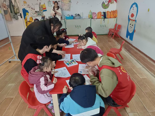图 志愿者陪伴小朋友绘图的温馨欢乐画面