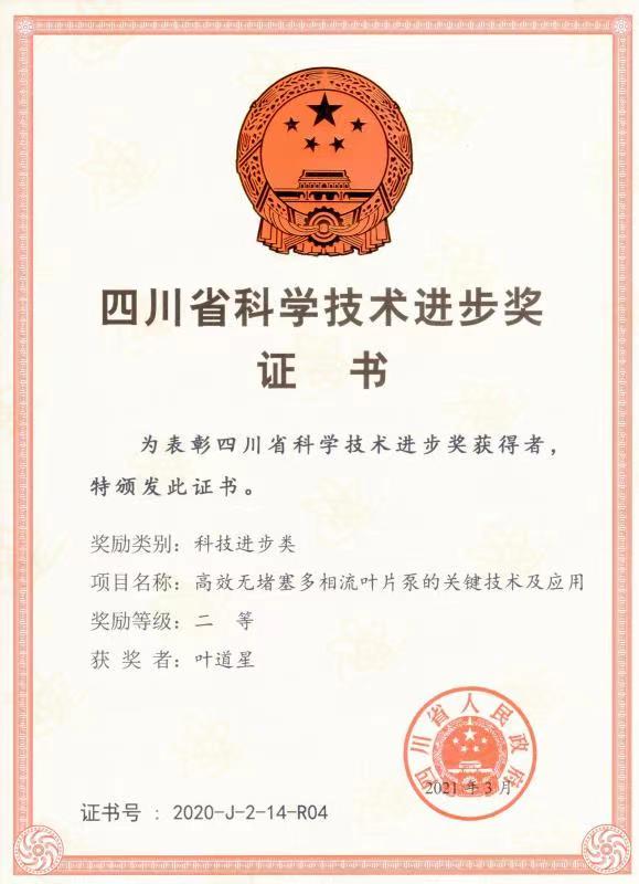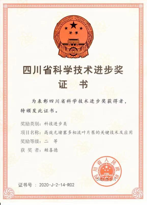 2020度四川省科学技术奖励大会于3月17日在成都举行。我校作为第二单位参与的 “高效无堵塞多相流叶片泵的关键技术及应用”项目获得2020度四川省科技进步二等奖,能源与动力工程学院赖喜德教授、叶道星副教授作为主要完成人喜获该项目个人奖。
