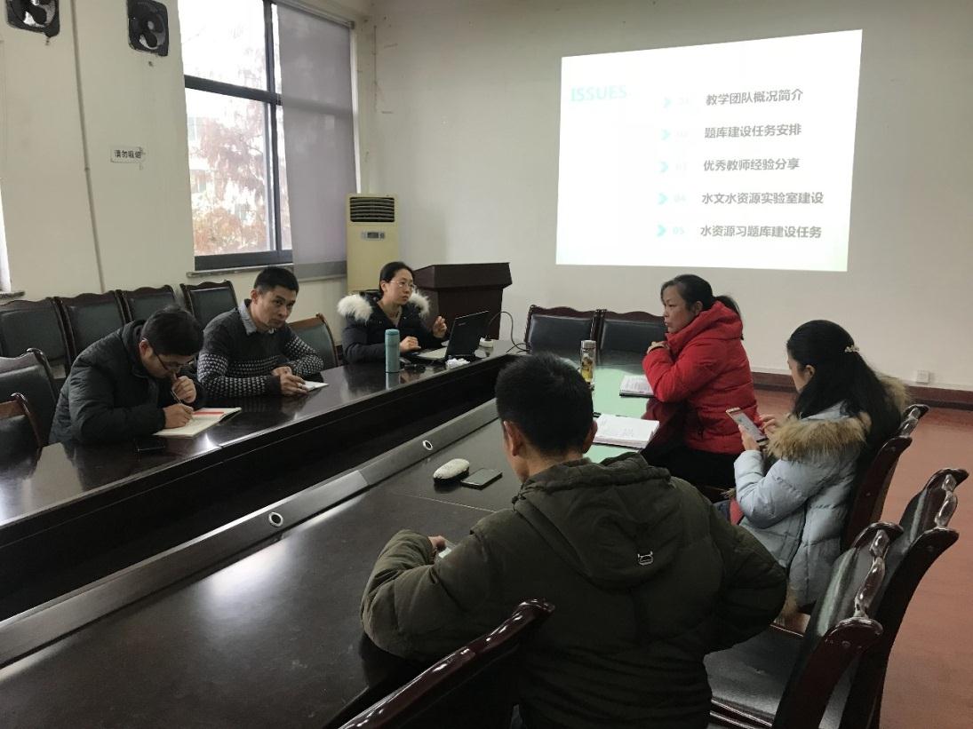 最后,付成华、张婧分别就工程水文学、水资源规划及利用两门课程的习题库建设任务进行分解。参会的团队成员针对团队建设方式、习题库的参考资料、题目来源等等进行了进一步讨论。