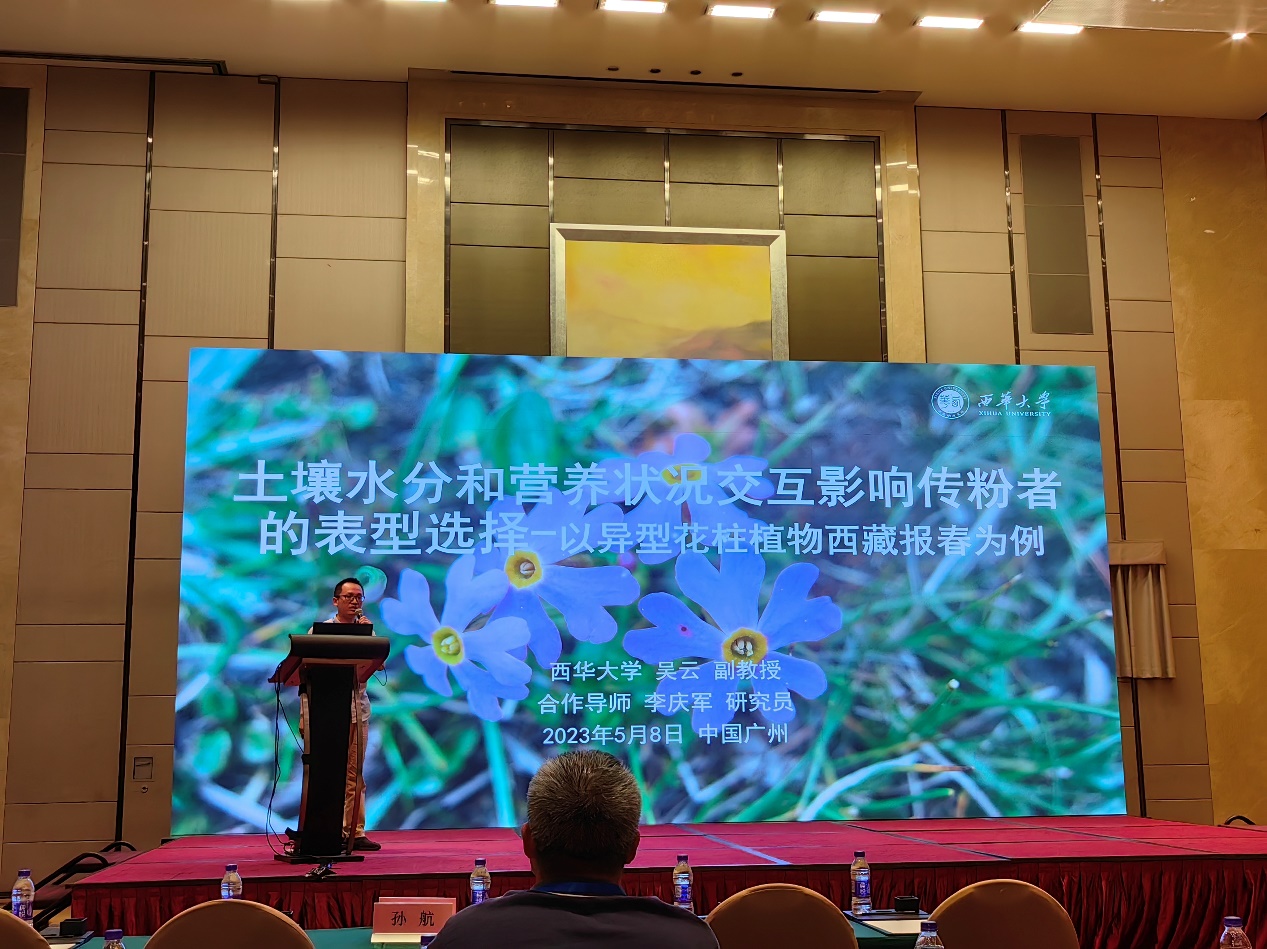 吴云副教授的报告题目为“土壤水分和营养状况交互影响传粉者的表型选择-以异型花柱植物西藏报春为例”。吴云副教授在报告中指出,自然选择经典理论认为,植物传粉者互作机制是驱动植物花性状进化的重要动力。然而,植物面临的往往是复杂多样的生物与非生物环境。传粉者施加的表型选择压力往往受到非传粉者因子的影响。研究以分布于青藏高原的西藏报春(Primula tibetica)为材料,通过操控试验和析因试验,定量研究土壤水分和营养状况因子对传粉者施加表型选择的影响以及此影响的实现途径。研究表明,两类非生物因子能够影响西藏报春的雌性繁殖成功,此影响既有主体作用,又有交互协同作用。传粉者驱动西藏报春单花性状和组合花性状的进化,但土壤水分和营养状况因子在此过程中起着重要作用。研究证明,土壤水分和营养状况影响传粉者施加给植物花性状的表型选择,主要目标性状是花展示性状(植株高度和开花数目)。两类因子通过影响植物雌性适合度,继而影响传粉者施加的表型选择作用。研究表明,单纯通过动植物关系来衡量表型选择的大小是不够全面的,需要全方位的考虑目标物种所处的生物与非生物环境。
