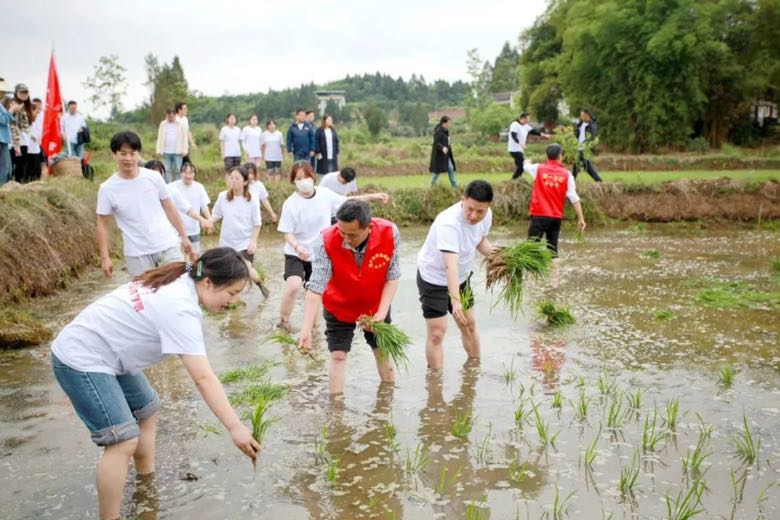 四川发布客户端消息 5月8日,西华大学美术与设计学院党员师生一行 48人,来到西华大学定点帮扶点南充市嘉陵区龙蟠镇水堰口村开展“田间插秧践初心 忆苦思甜促振兴”主题党日活动,围绕助力乡村振兴,涵养知农爱农情怀,师生们将党课搬到田间地头,通过体验插秧、调研座谈和参观交流等活动,开展了一堂生动的劳动实践课。