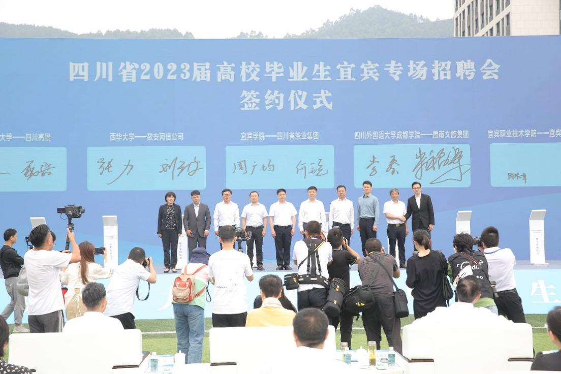 招聘会启动仪式现场,西华大学、宜宾学院、四川外国语大学成都学院、宜宾职业技术学院等十所高校与十家企业分别现场签署合作协议。学校党委副书记张力代表学校与四川数安网信科技有限责任公司签署合作协议。