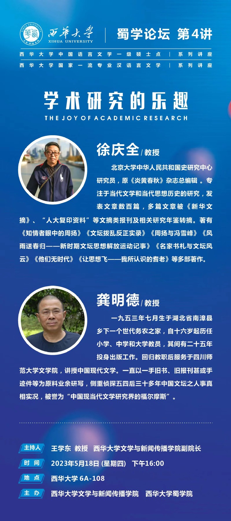 龚明德教授,1953年7月生于湖北省南漳县乡下一个世代务农之家,自16岁起历任小学、中学和大学教员,其间有25年投身出版工作。回归教职后服务于四川师范大学文学院,讲授中国现代文学。一直以一手旧书、旧报刊甚或手迹件等为原料业余研写,侧重侦探五四后30多年中国文坛之人事真相实况,被誉为“中国现当代文学研究界的福尔摩斯”。