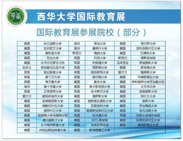 本次国际教育展由西华大学国际教育学院主办,邀请到了来自 11 个国家,44 所海外名校的校方代表和 16 位面试招生官莅临现场,来访院校有:布兰迪斯大学、加州欧文大学、东北大学、诺丁汉大学、考文垂的大学、南十字星大学、俄勒冈州立大学等等。