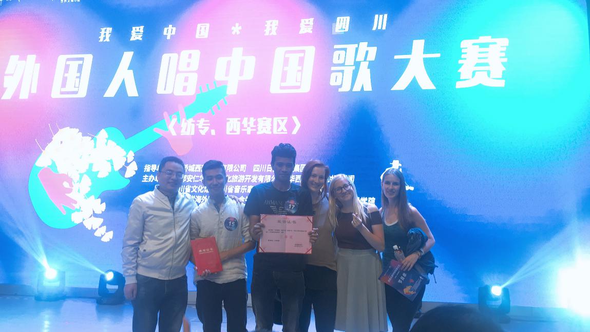 4月17日下午,“华侨城杯·我爱中国·我爱四川·外国人唱中国歌曲大赛”在成都纺织高等专科学校再次“开战”,来自老挝、捷克、尼泊尔等国的留学生在舞台上为了半决赛名额大展歌喉,放声歌唱。