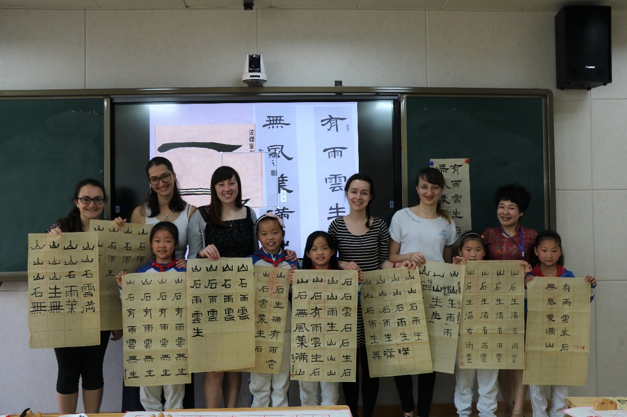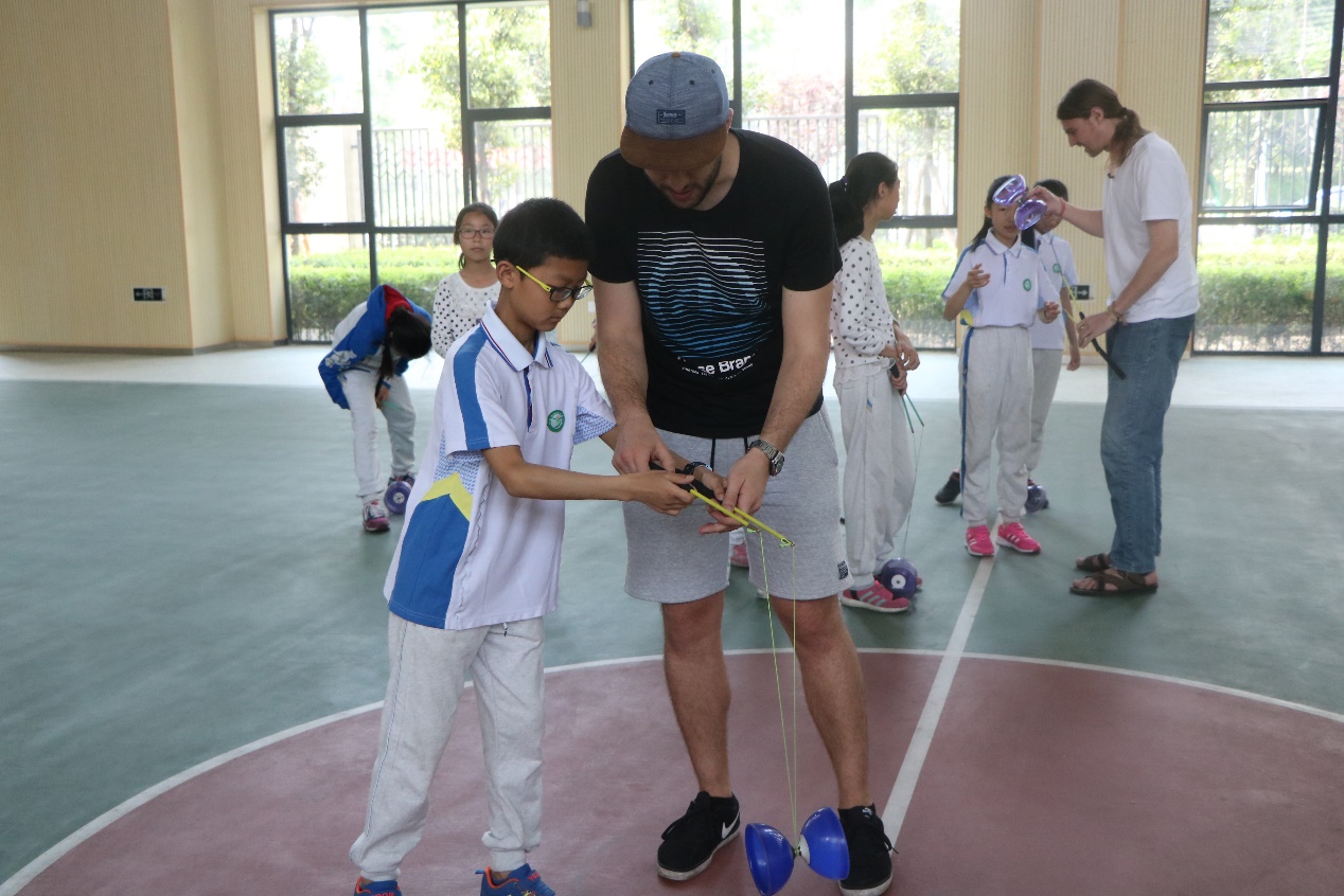 接下来,留学生大朋友分组和孩子们一起进入了有趣的泥塑、美术、英语、书法、体育五个课堂。在泥塑课堂中,小朋友和大朋友们一起手“塑”国宝。课后,尚阳孩子们送给了大朋友一些熊猫手机挂饰和熊猫别针作为礼物。在国画课堂上,留学生们和孩子一起手执毛笔画可爱的大熊猫,感受妙笔丹青国画之美。他们还为孩子们唱了一首欢快的捷克歌曲。在书法课堂上,悠扬古琴声,温婉旗袍装,淡淡笔墨香,留学生拿起毛笔,尚阳的小学生们当起了小老师,教外国客人一笔一划体验中国的悠远文化。在英语课堂中,孩子们热情的跟外国友人打招呼:"Hello, nice to meet you.",教学中,留学生也积极参与孩子们的讨论,带着孩子们玩英语游戏“Simon says...”,孩子们开心极了。在空竹课堂上,孩子们首先展示了一段精彩的花式空竹表演;之后留学生教小孩子们跳了两支捷克传统交际舞蹈"bird dance"和"mazurka",课堂的氛围一下子活跃起来,大家一起共舞。外国友人加入学生的体育小组一起学习空竹的基本动作,外国友人很快地学会了如何玩转花式空竹。此次交流活动在热烈愉快的互动中圆满结束。此次交流活动不仅为留学生搭建了了解中国小学教育的桥梁,也为他们近距离的了解中国的传统和现代文化提供了一次很好的机会。