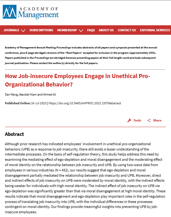 该论文摘要被Academy of Management Annual Meeting Proceedings收录,并于2023年7月24日在线发表。