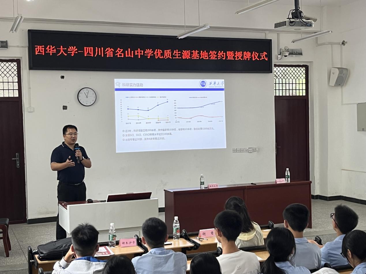 名山中学党委书记、校长李详、文庙校区执行校长张军奎对谢书记一行表示了热烈的欢迎,张校长带领我院一行参观了名山中学,介绍了学校的历史沿革和基本情况。随后,在学校会议室举行了招生宣讲,并举行了“优质生源基地”授牌仪式。学院工商管理系主任丁灿详细地介绍了西华大学的概况和办学优势,也让高中生对我院的专业有了更加直观的了解。讲座过程中,同学们掌声不断,与老师们积极互动,现场氛围良好。