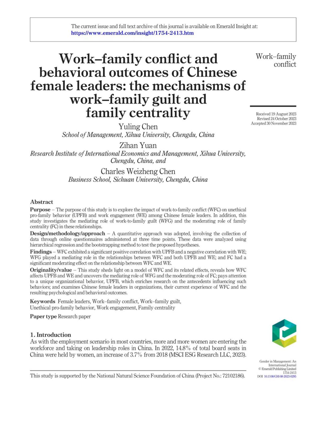 此外,管理学院、国际经济与管理研究院陈玉玲副教授研究团队在女性研究领域国际期刊《Gender in Management: An International Journal》(SSCI 一区)发表题为“Work-family conflict and behavioral outcomes of Chinese female leaders: the mechanisms of work-family guilt and family centrality”的研究论文。陈玉玲副教授为论文的第一作者,国际经济与管理研究院2021级工商管理专业硕士研究生袁梓涵、四川大学陈维政教授为论文的共同通讯作者。西华大学为论文的第一完成单位。该研究工作为国家自然科学基金青年基金项目(72102186)的阶段性成果之一。