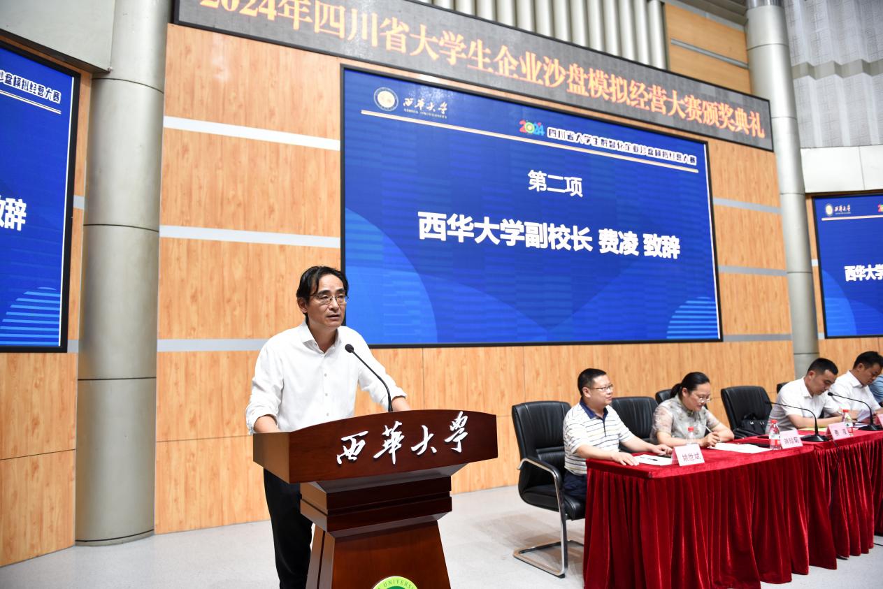 颁奖典礼上,西华大学副校长费凌讲话。费凌指出,本赛事已连续举办十一年,西华大学连续承办十一年。当前,数智化人才培养是当今世界各国竞相发展的战略需求,我国现代化建设要求加强数字化、智能化、信息化等方面的能力建设,以适应日益激烈的国际竞争和全球化发展的需要。本次大赛正是提升数智化经管类人才培养的重要举措。希望各位获奖选手珍惜荣誉,不断提高自己,为四川省社会经济发展贡献更多的智慧和力量。