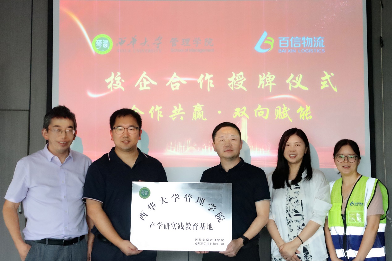 为进一步丰富学生社会实践模式,深化校企合作,促进毕业生高质量就业,推动产学研深度融合,7月10日,管理学院工商管理系丁灿主任、教师徐武明,赴新都区成都百信运业有限公司举行产学研创新实践教学基地挂牌仪式,百信运业董事长胡学斌,副总经理王欢,人事主管陆冬利等参加会议。