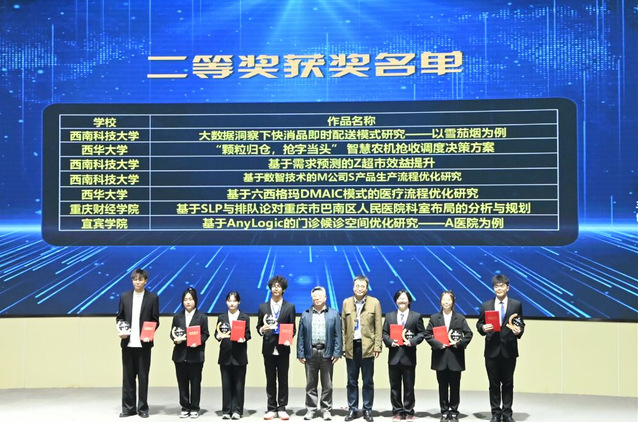 大赛自9月启动以来共吸引了四川大学、电子科技大学、西南交通大学、西华大学、西南科技大学、重庆财经学院、宜宾学院等多所西南地区高校参赛,最终11支参赛队伍进入决赛。由我校工业工程专业张渝慧、邓斯尹、魏道高、廖芷怡、彭静同学组成的参赛队表现出色,获得评委专家组一致好评,荣获本次大赛一等奖。同时,由我校肖雅桐、何雨城、陈雪梅、古小楠、邹旭同学组成的队伍与李雨涵、陈美依辰、陈俊波、白明宇、梁学同学组成的队伍赢得专家们的肯定,荣获二等奖