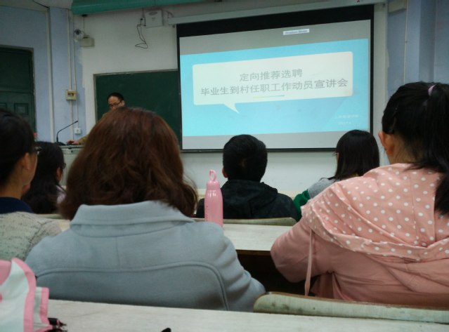为认真做好2017年定向推荐选聘毕业生到村任职工作,引导和鼓励优秀毕业生投身新农村建设,4月5日中午,管理学院在3B303举办了大学生村官选聘动员会,学院毕业班辅导员,部分学生干部和部分毕业生党员参加了此次动员会。