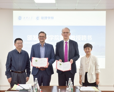 会议由肖东华书记主持。邵永波副校长在致辞中对明斯特应用技术大学两位教授到来表示热烈欢迎,并强调了两校合作的重要意义。赵修文院长介绍了管理学院的发展情况及未来合作展望。明斯特应用技术大学的Balz教授也发表了讲话,分享了该校在国际教育合作方面的经验,并表达了对双方合作的期待。管理学院向明斯特应用技术大学Ulrich Balz教授和Marcus Laumann教授颁发了客座教授聘书。