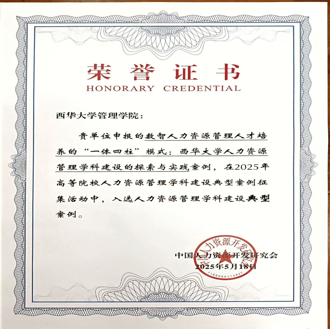 最后,由专业负责人肖金岑副教授牵头撰写的学科建设报告《数智人力资源管理人才培养的“一体四柱”模式:西华大学人力资源管理学科建设的探索与实践》被评选为典型案例,赵修文教授代表本专业进行领奖。